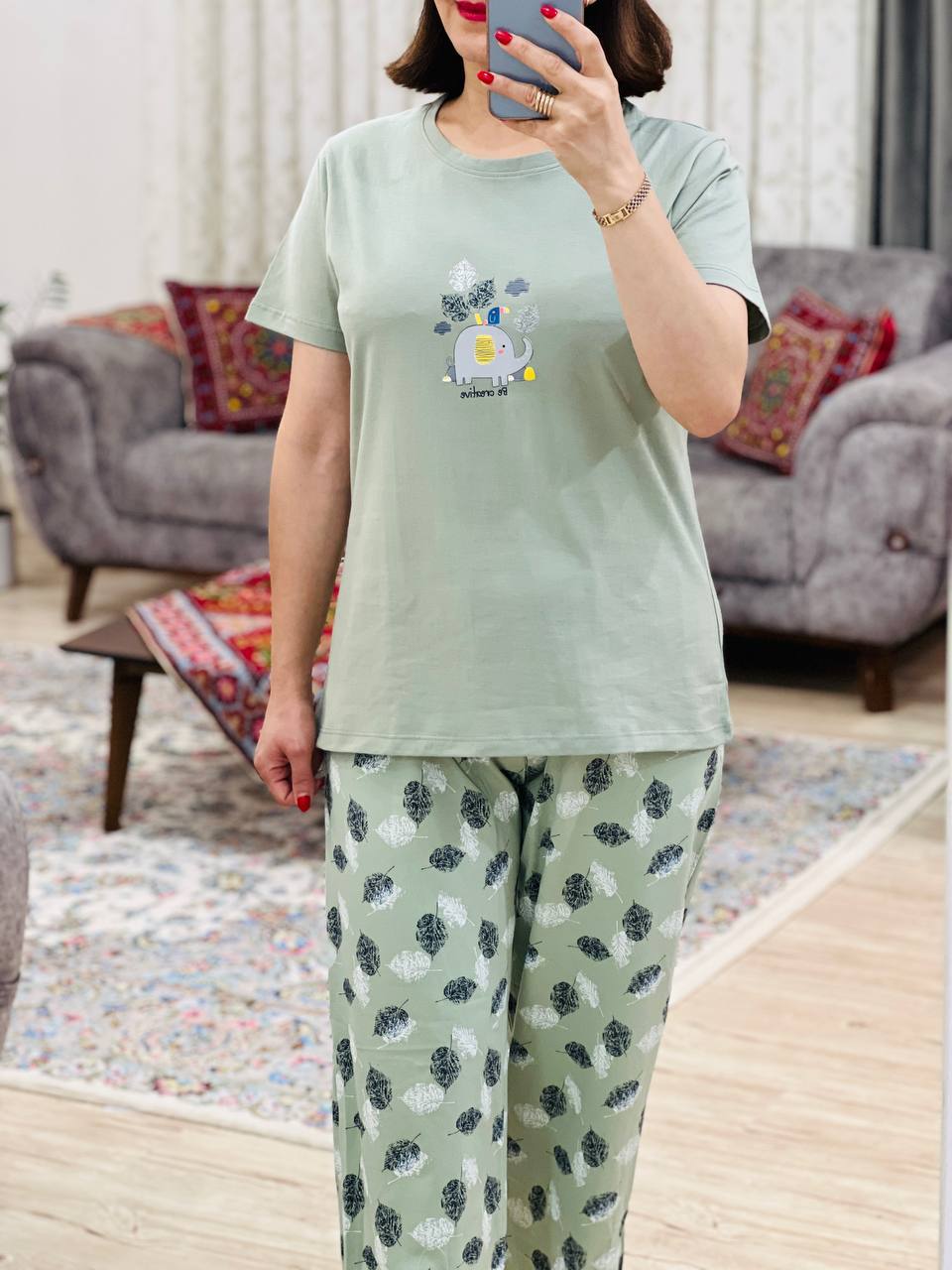 جنس تیشرت پنبه تک رو / جنس شلوار پنبه / چاپ و رنگ ثابت / حدودا 10 سانت کشسانی دارد / قواره ی هر تولیدی با تولیدی دیگر متفاوت است لطفا حتما سانت در نظر بگیرید