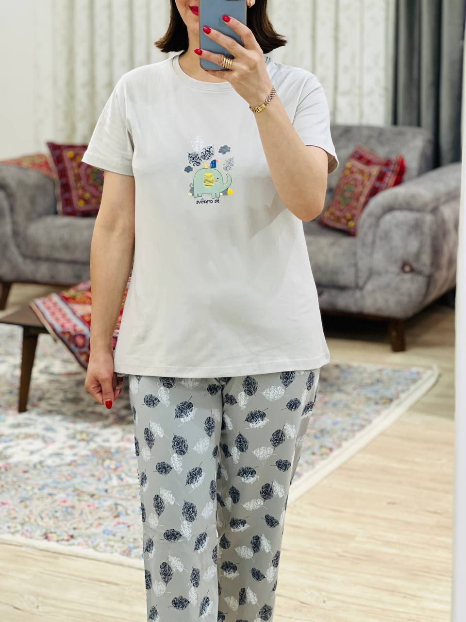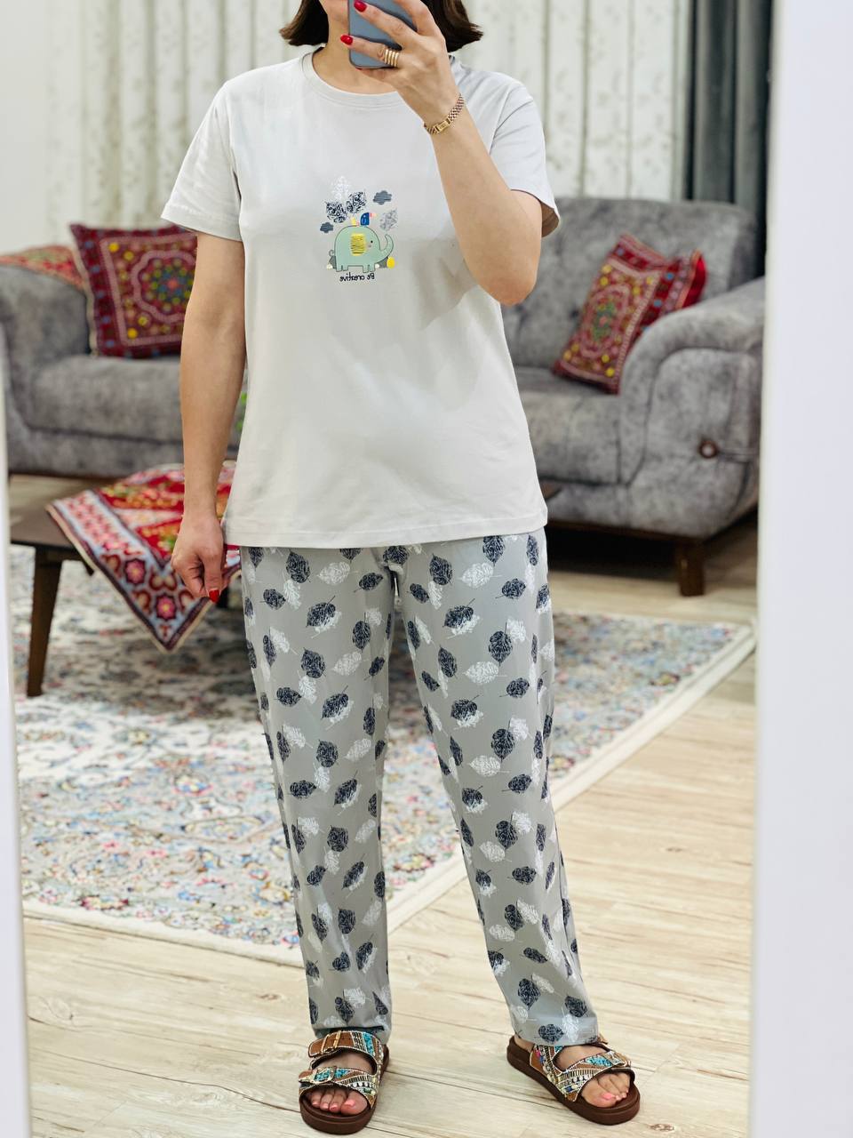 M مناسب 36 تا 38 / دور سینه 92 / قد تیشرت 64 / قد آستین 19 / قد شلوار 95 / فاق 30