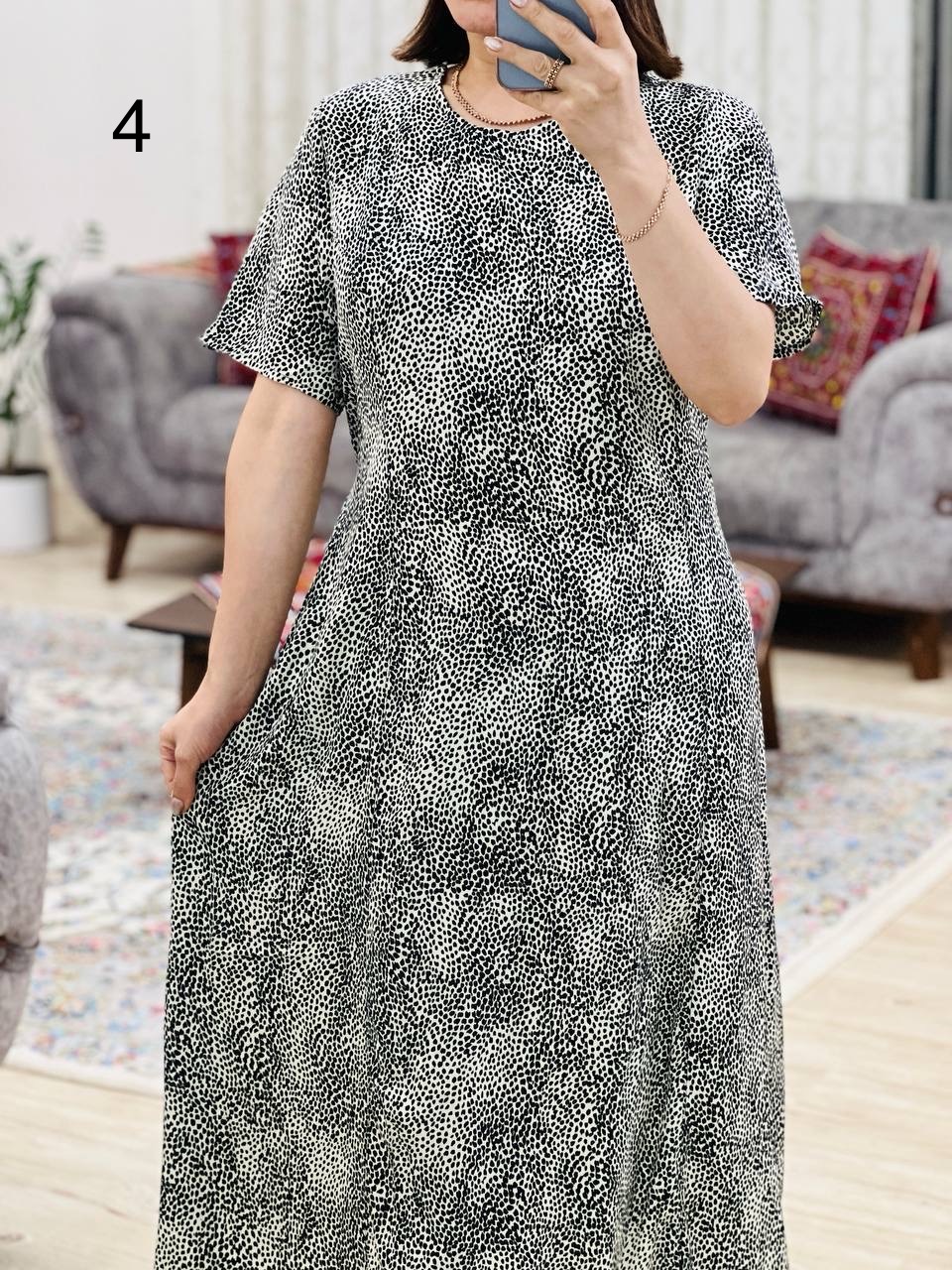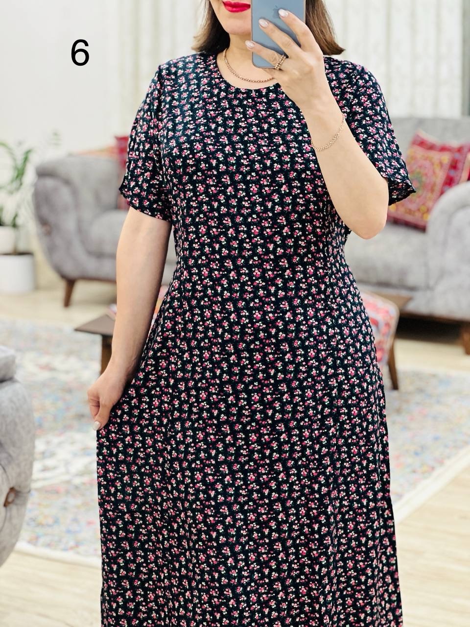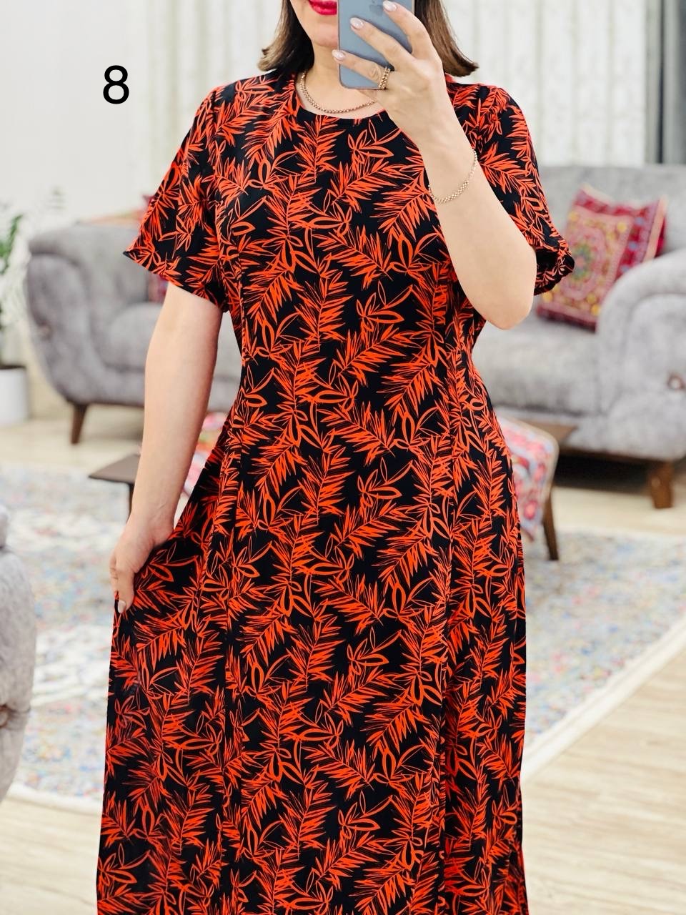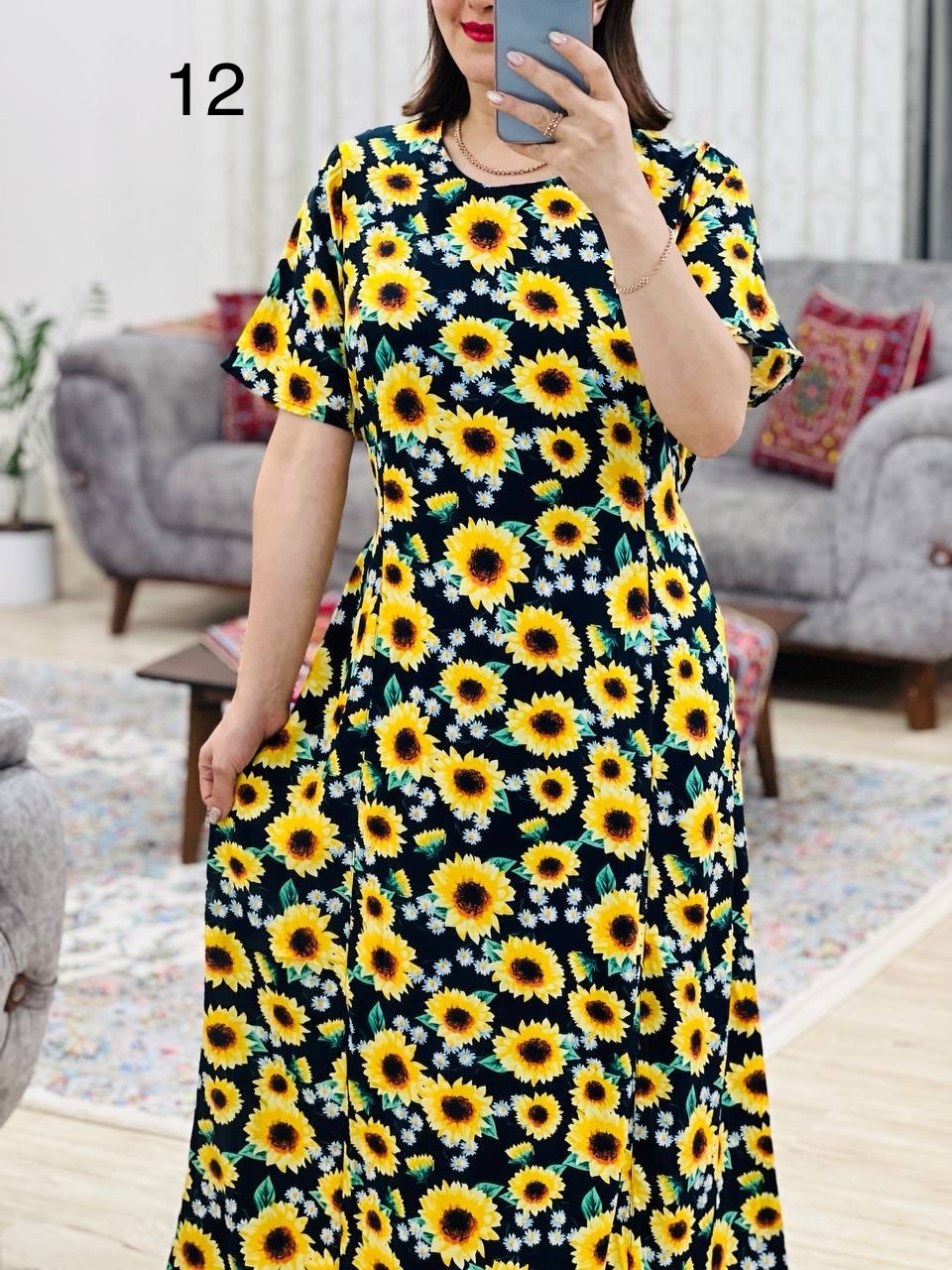 مناسب 44 تا 46 / دور سینه 120 / دور باسن 134 / قد پیراهن 125 / سرشانه 12 / دور بازو 50 / قد آستین 26