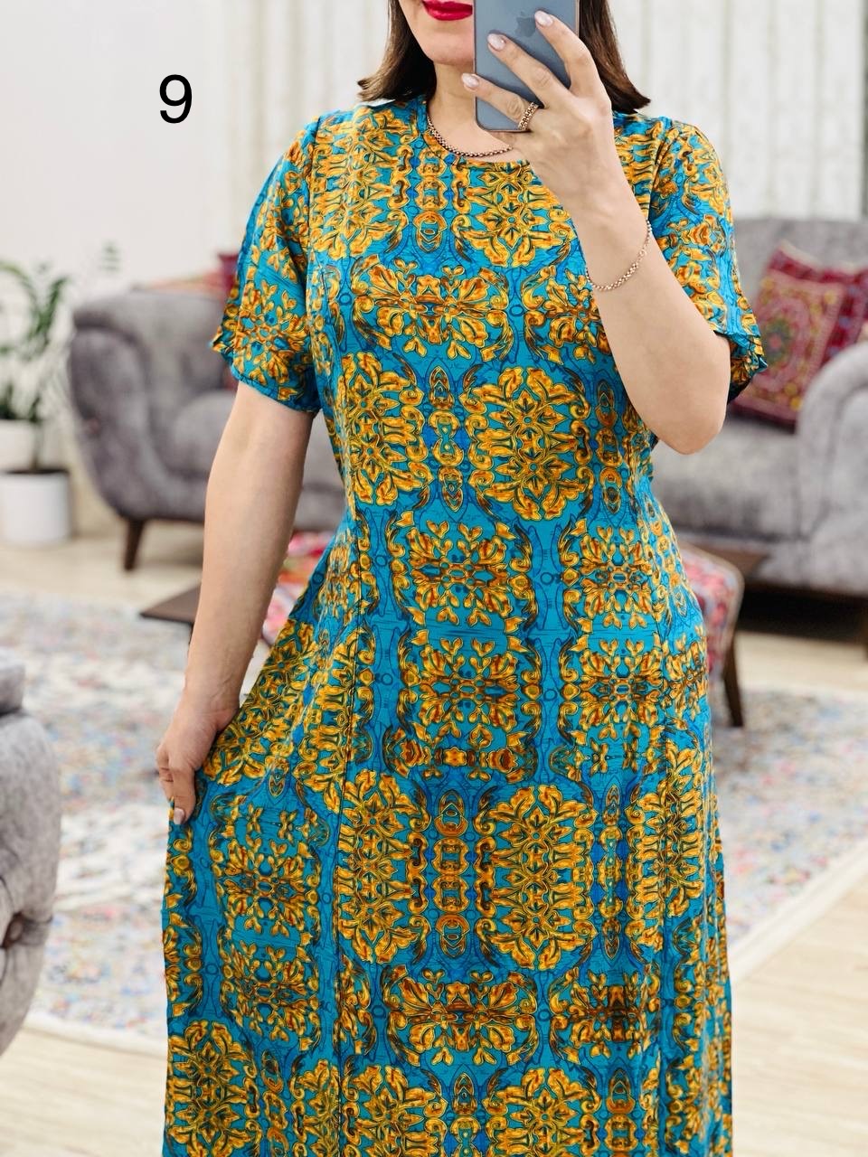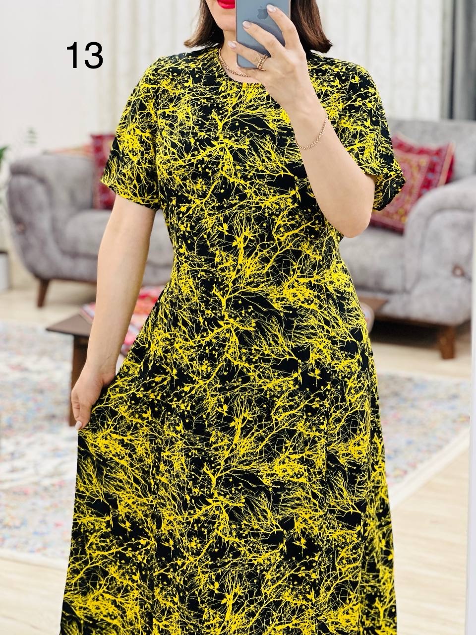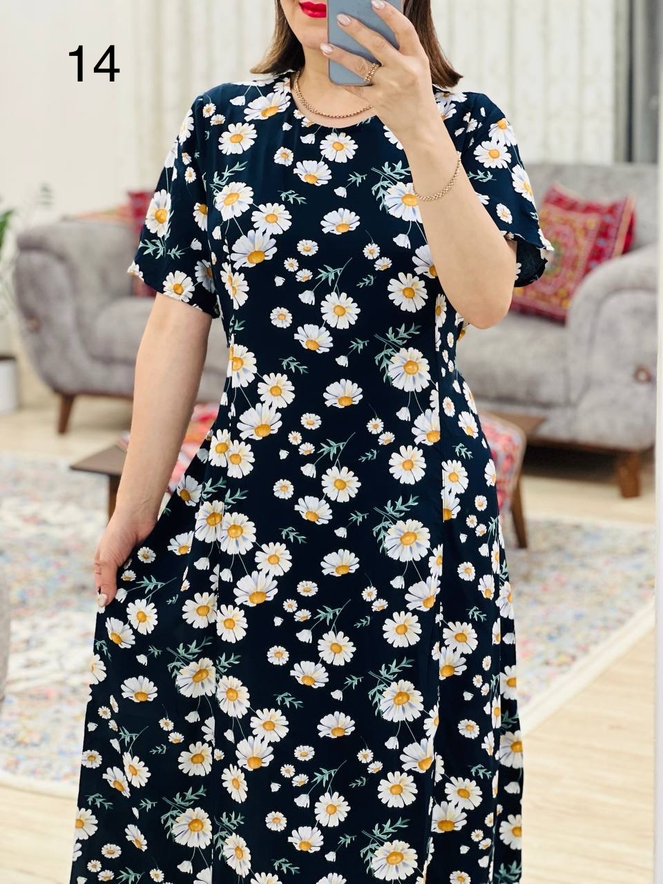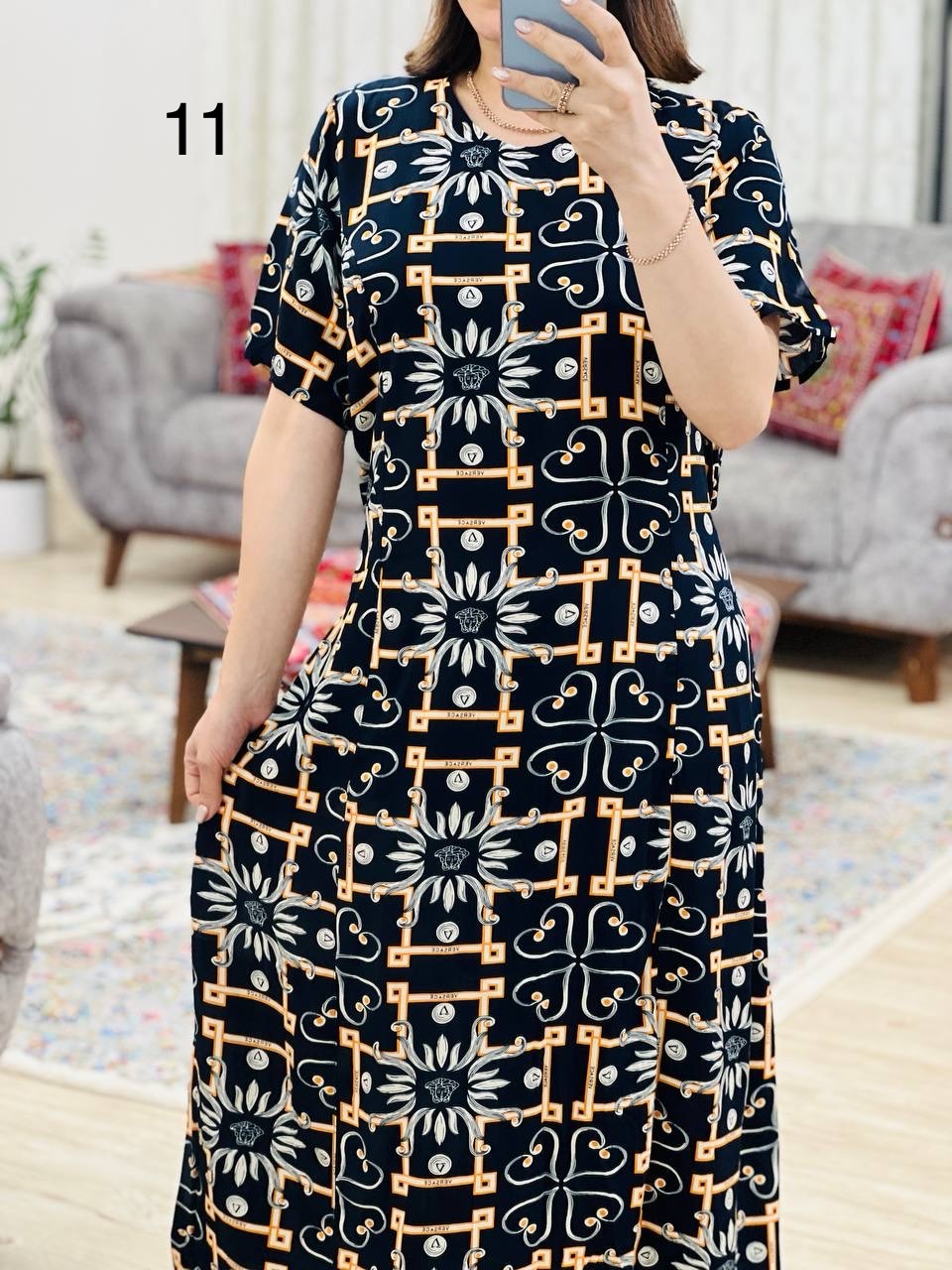 مناسب 44 تا 46 / دور سینه 120 / دور باسن 134 / قد پیراهن 125 / سرشانه 12 / دور بازو 50 / قد آستین 26