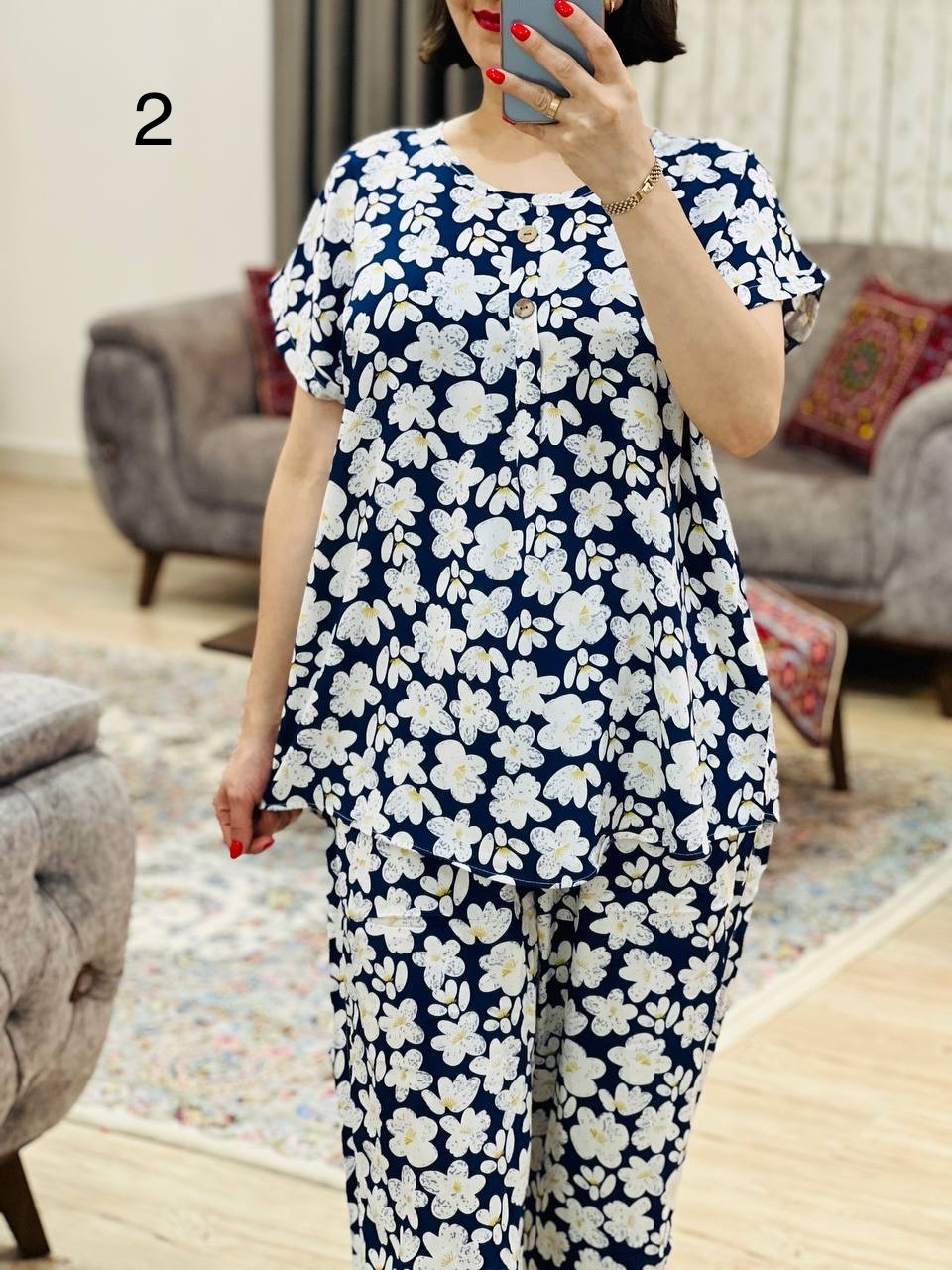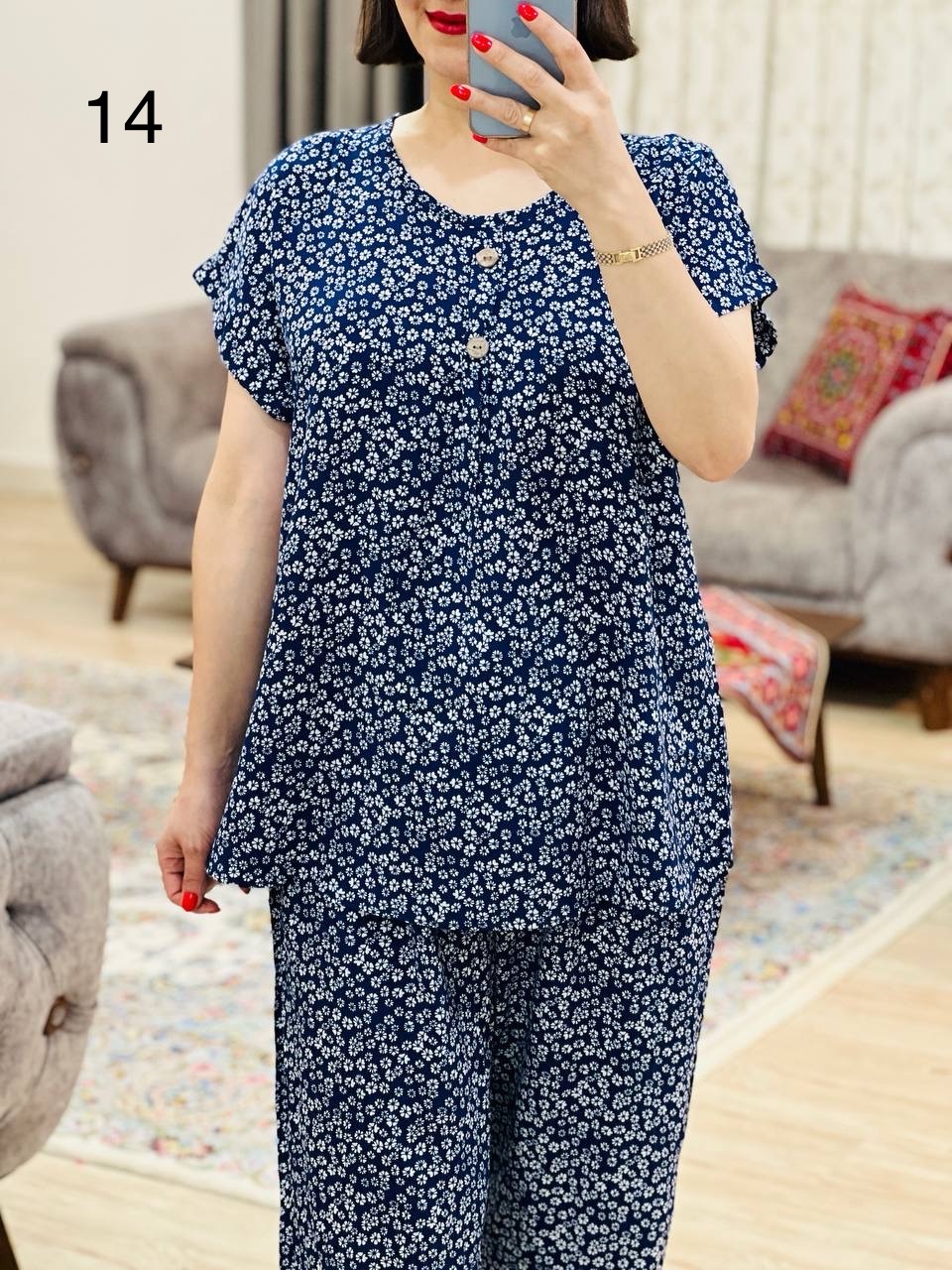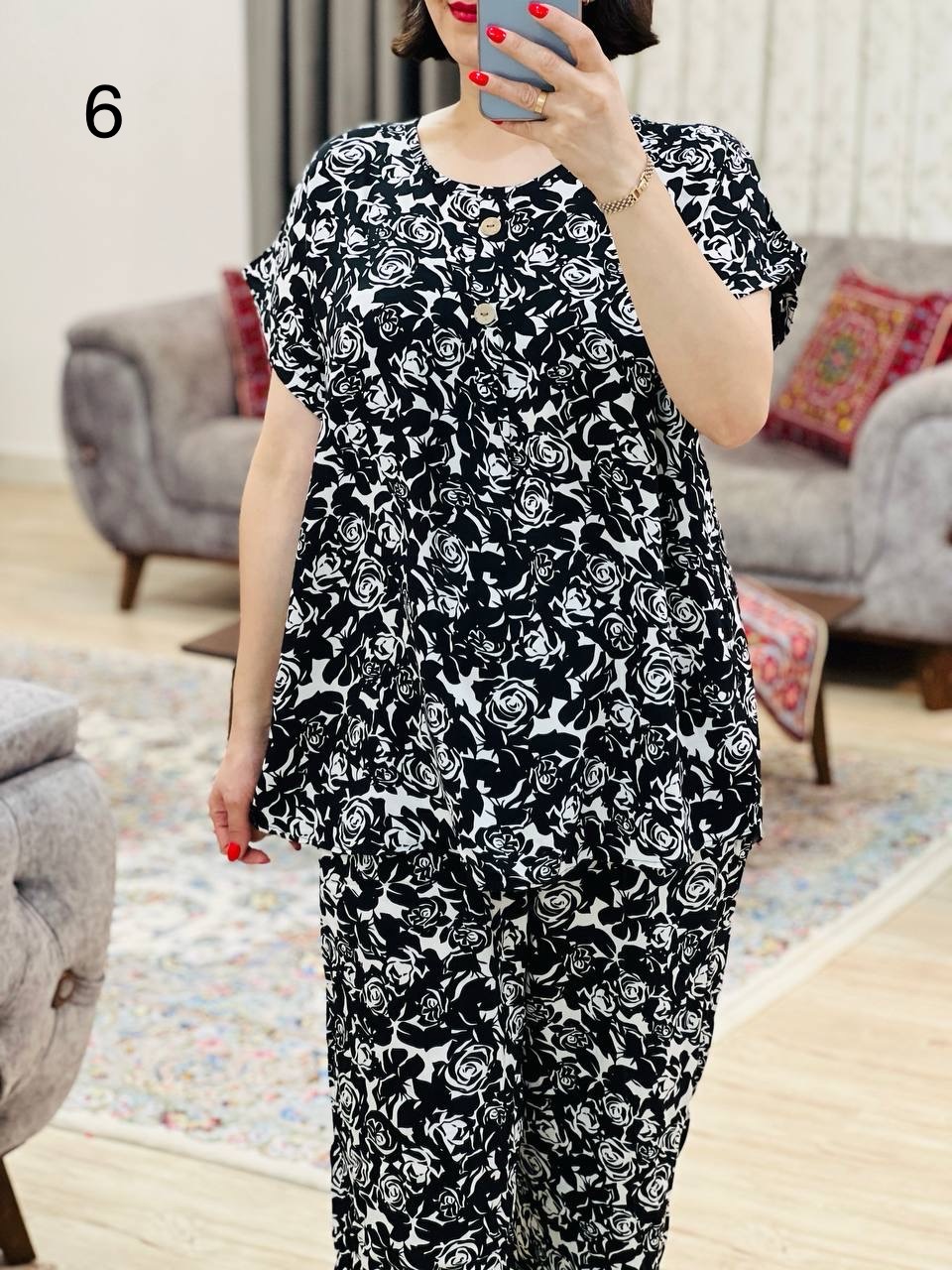 مناسب 40 تا 44 / دور سینه 108 / قد تیشرت 70 / قد آستین از یقه 23 / قد شلوار 99 / دور ران 70