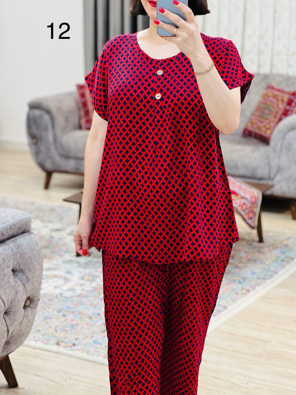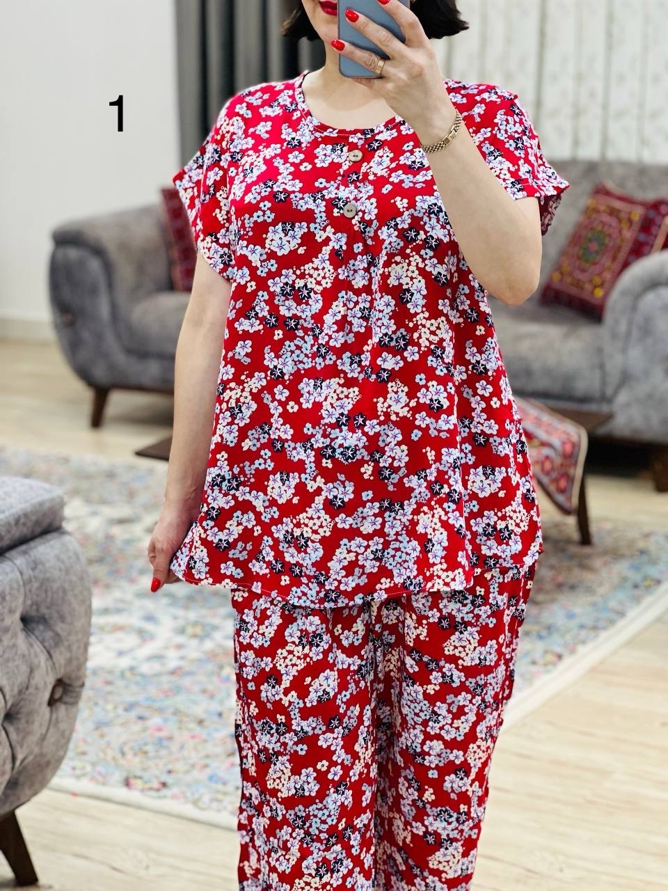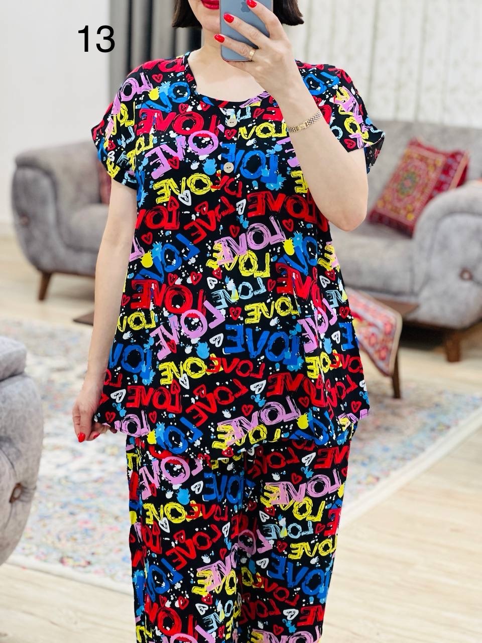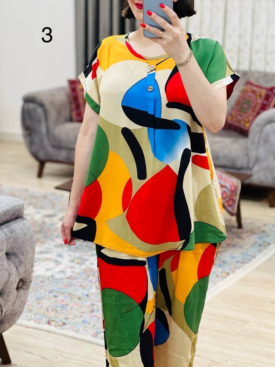 مناسب 40 تا 44 / دور سینه 108 / قد تیشرت 70 / قد آستین از یقه 23 / قد شلوار 99 / دور ران 70