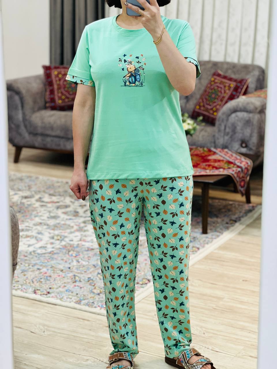جنس تیشرت پنبه تک رو / جنس شلوار پنبه / چاپ و رنگ ثابت / حدودا 10 سانت کشسانی دارد / قواره ی هر تولیدی با تولیدی دیگر متفاوت است لطفا حتما سانت در نظر بگیرید