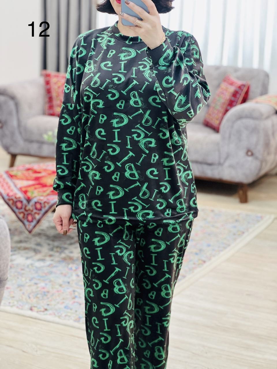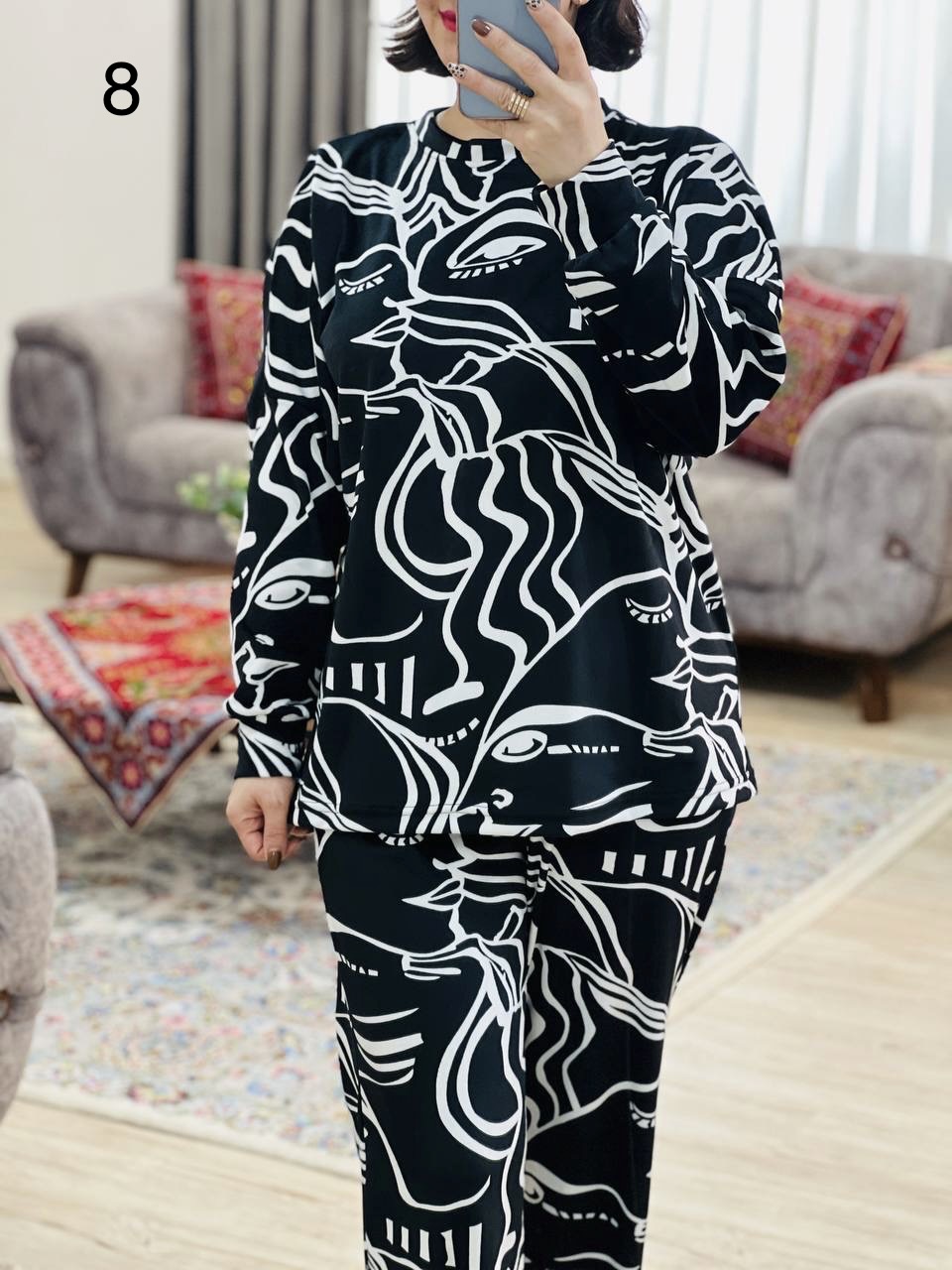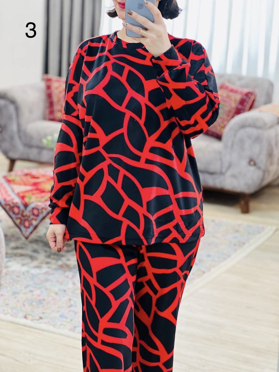 مناسب 40 تا 50 / دور سینه 140 / قد بلوز 67 / قد آستین از یقه 70 / قد شلوار 99 / فاق 33 / دور ران 62 / تمام سانتها بدون کشسانی نوشته شده