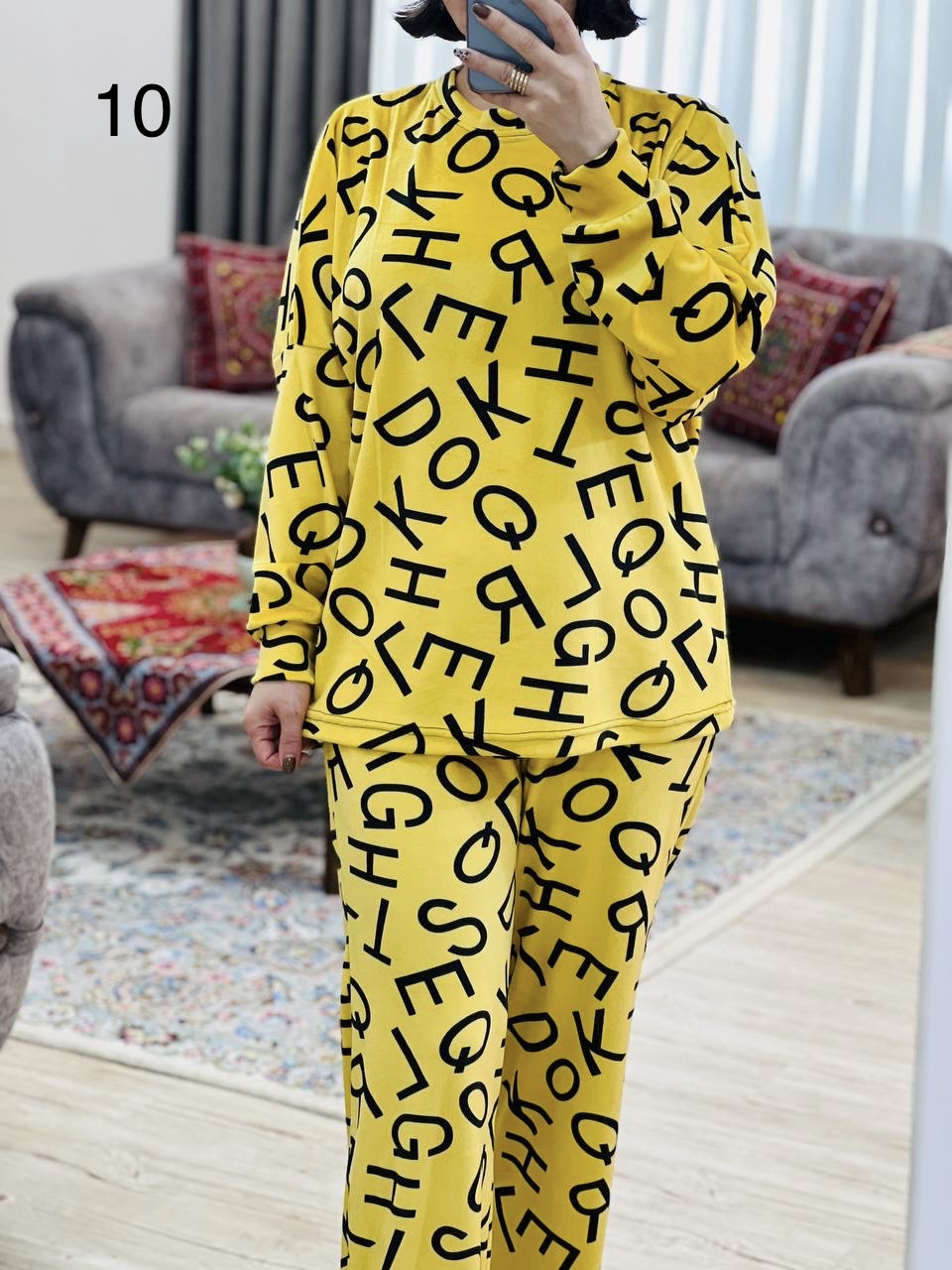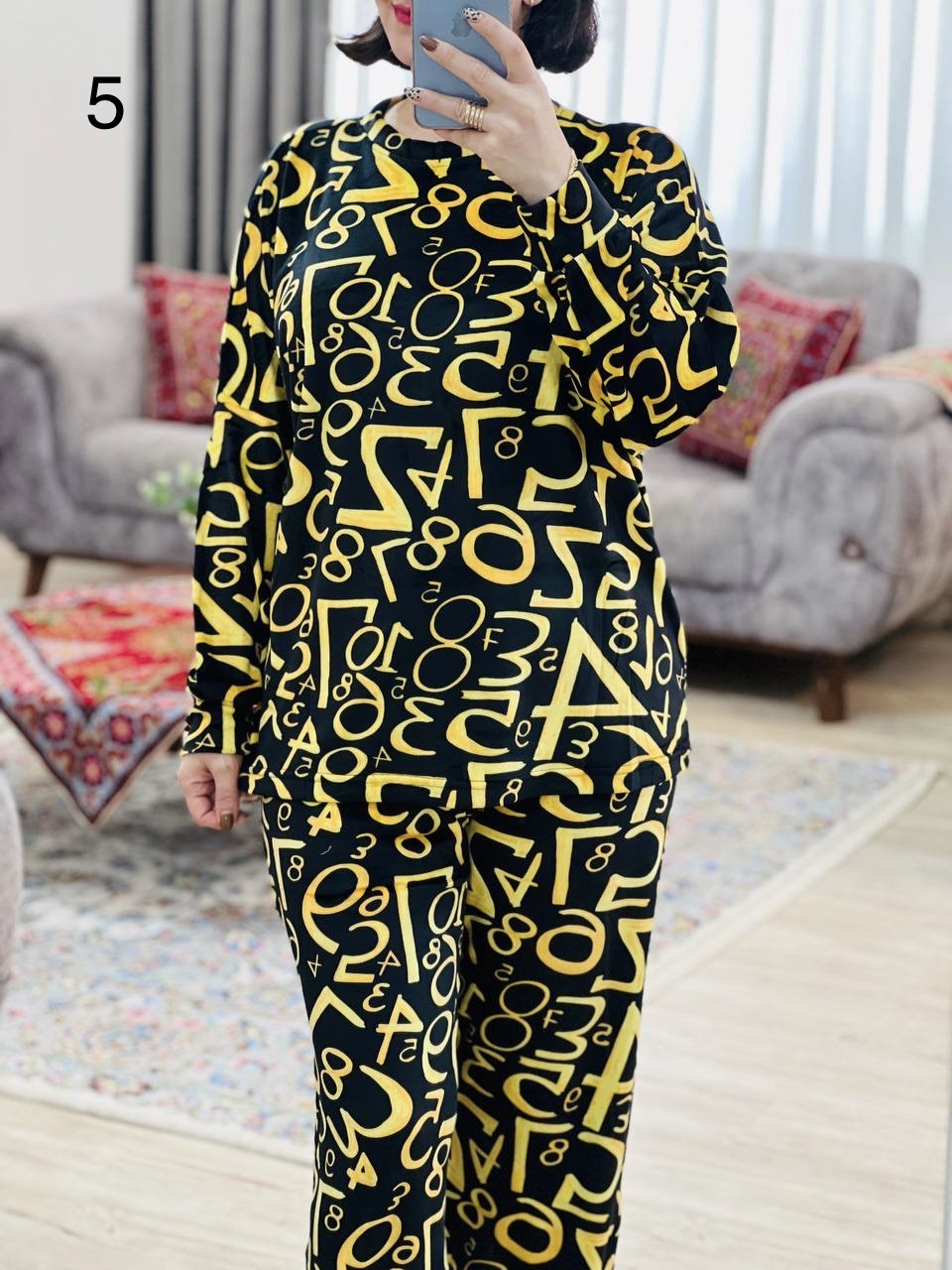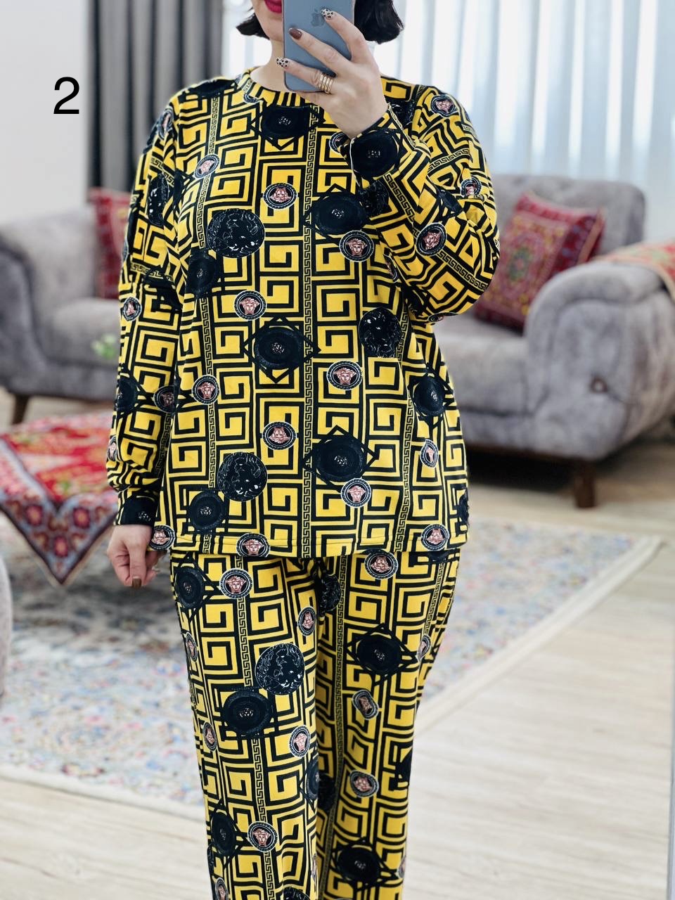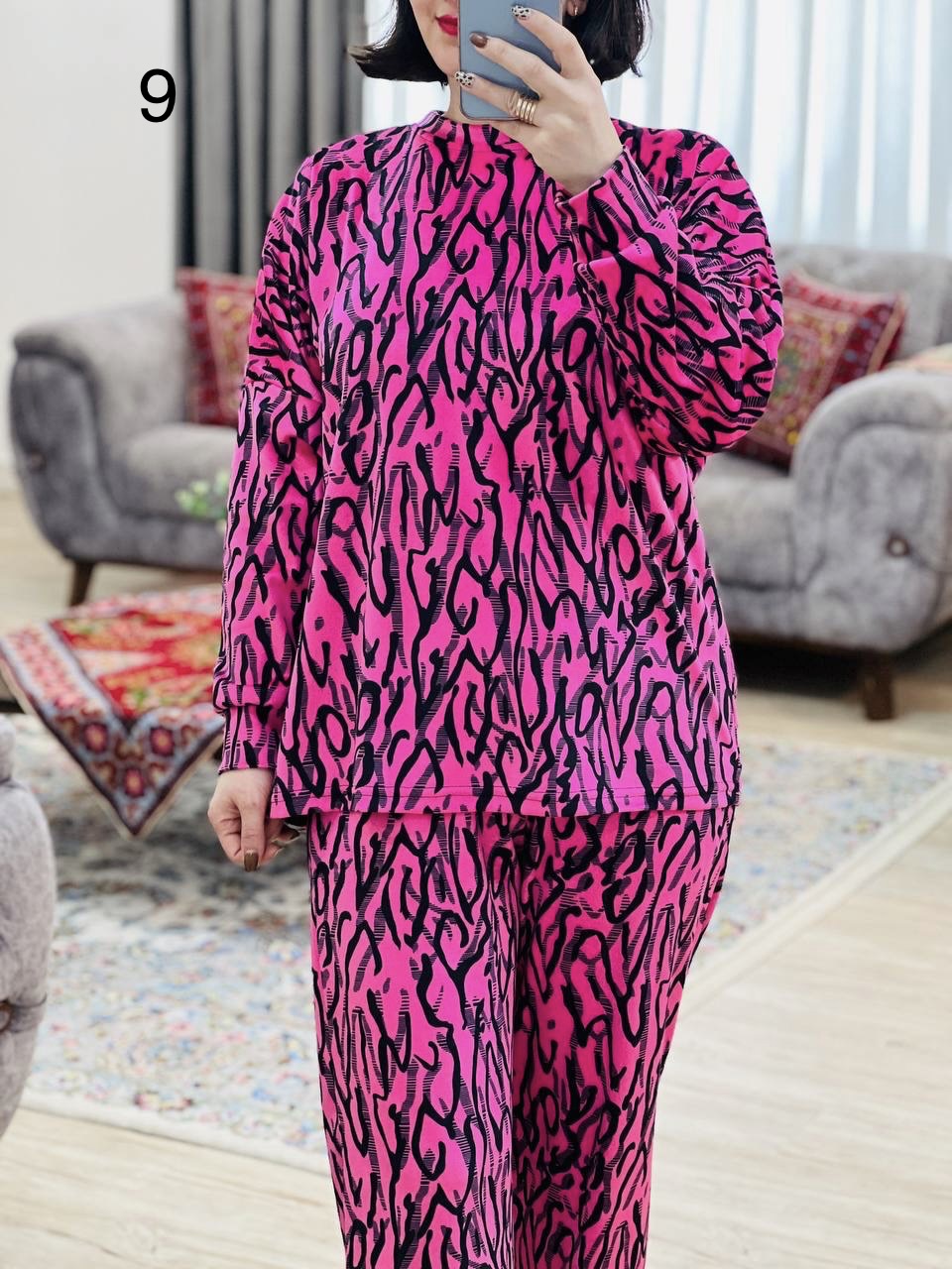 مناسب 40 تا 50 / دور سینه 140 / قد بلوز 67 / قد آستین از یقه 70 / قد شلوار 99 / فاق 33 / دور ران 62 / تمام سانتها بدون کشسانی نوشته شده