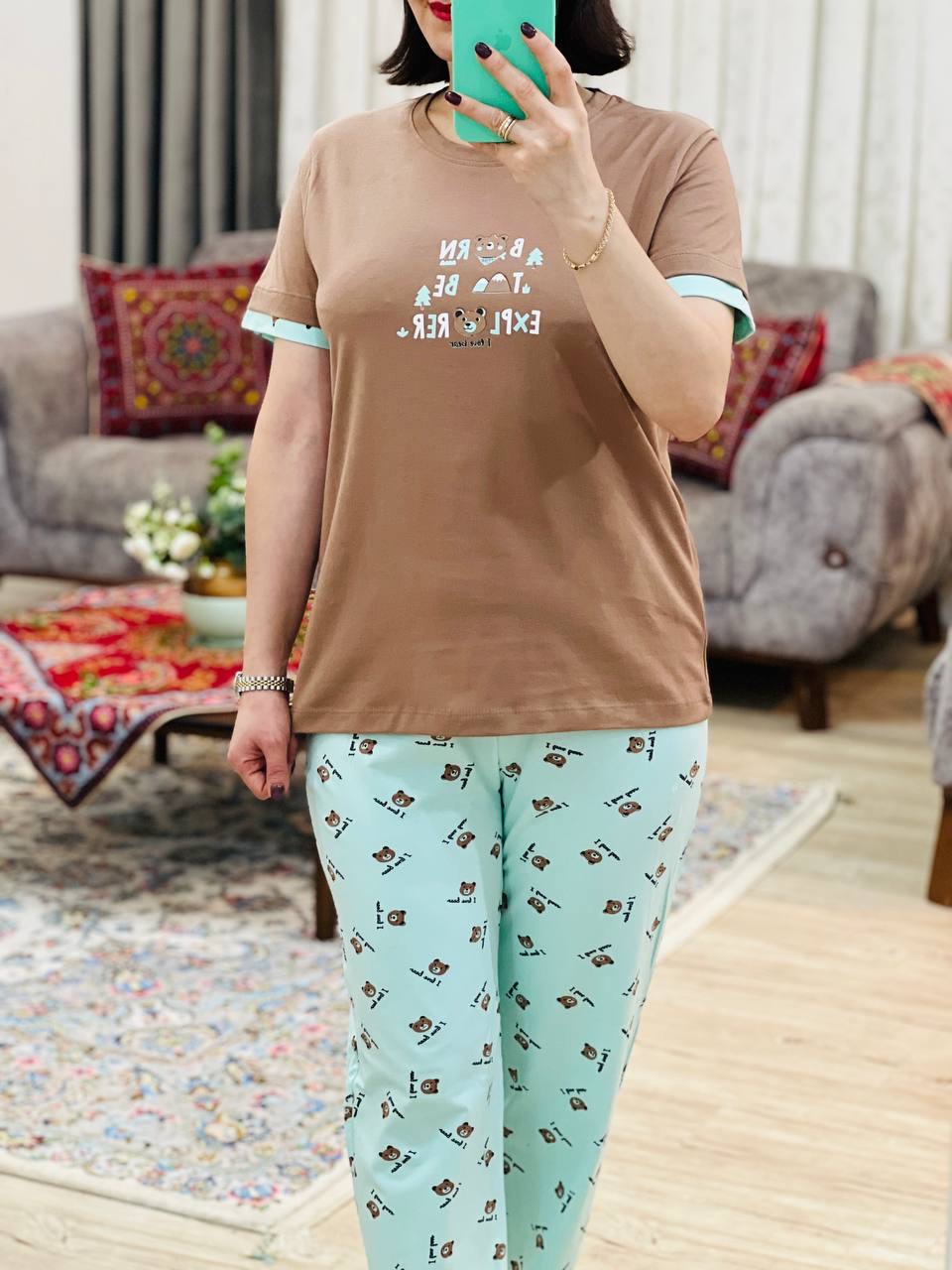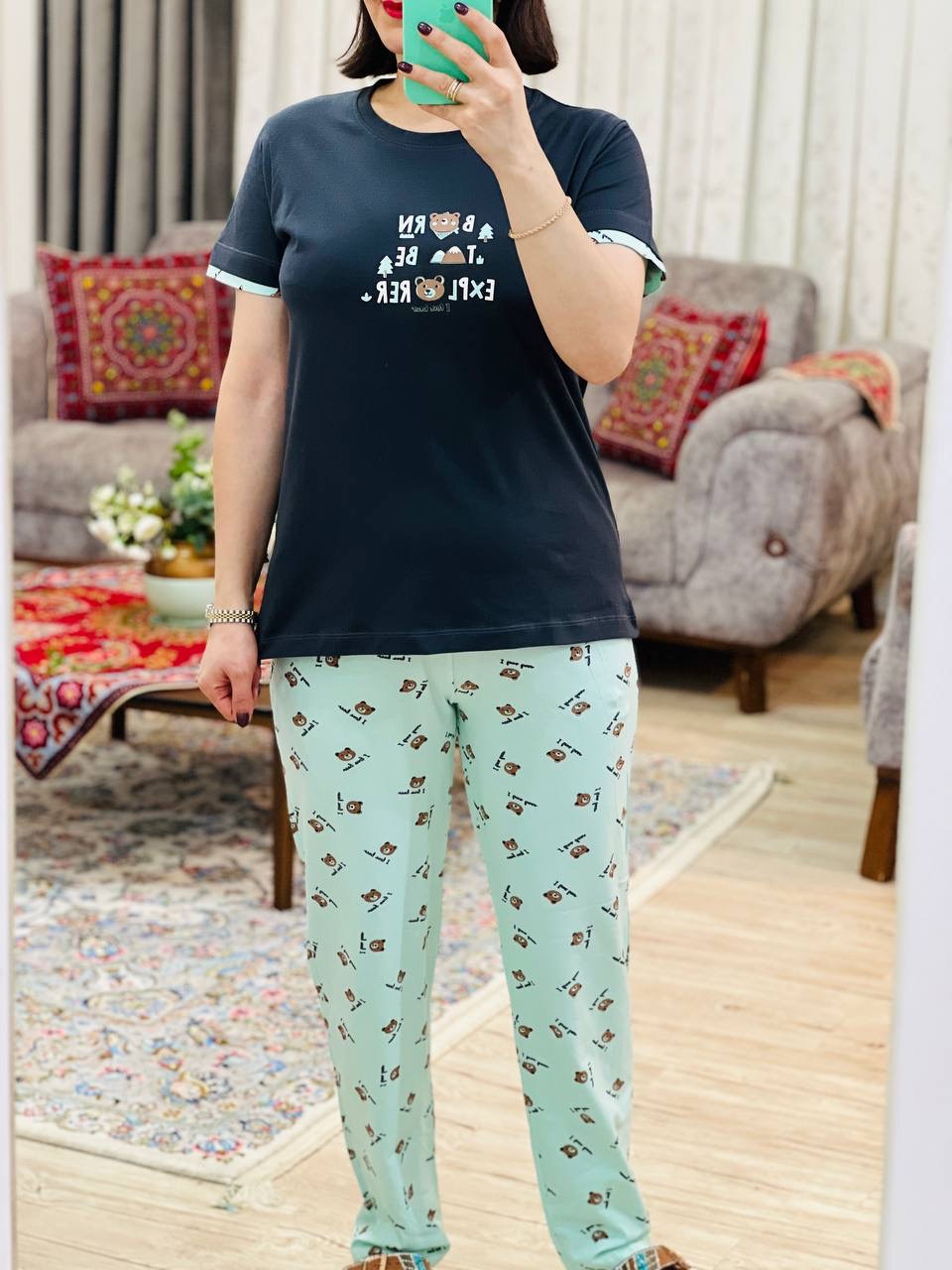 جنس تیشرت پنبه تک رو / جنس شلوار پنبه / چاپ و رنگ ثابت / حدودا 10 سانت کشسانی دارد / قواره ی هر تولیدی با تولیدی دیگر متفاوت است لطفا حتما سانت در نظر بگیرید