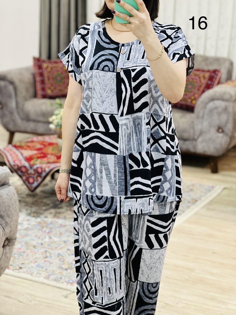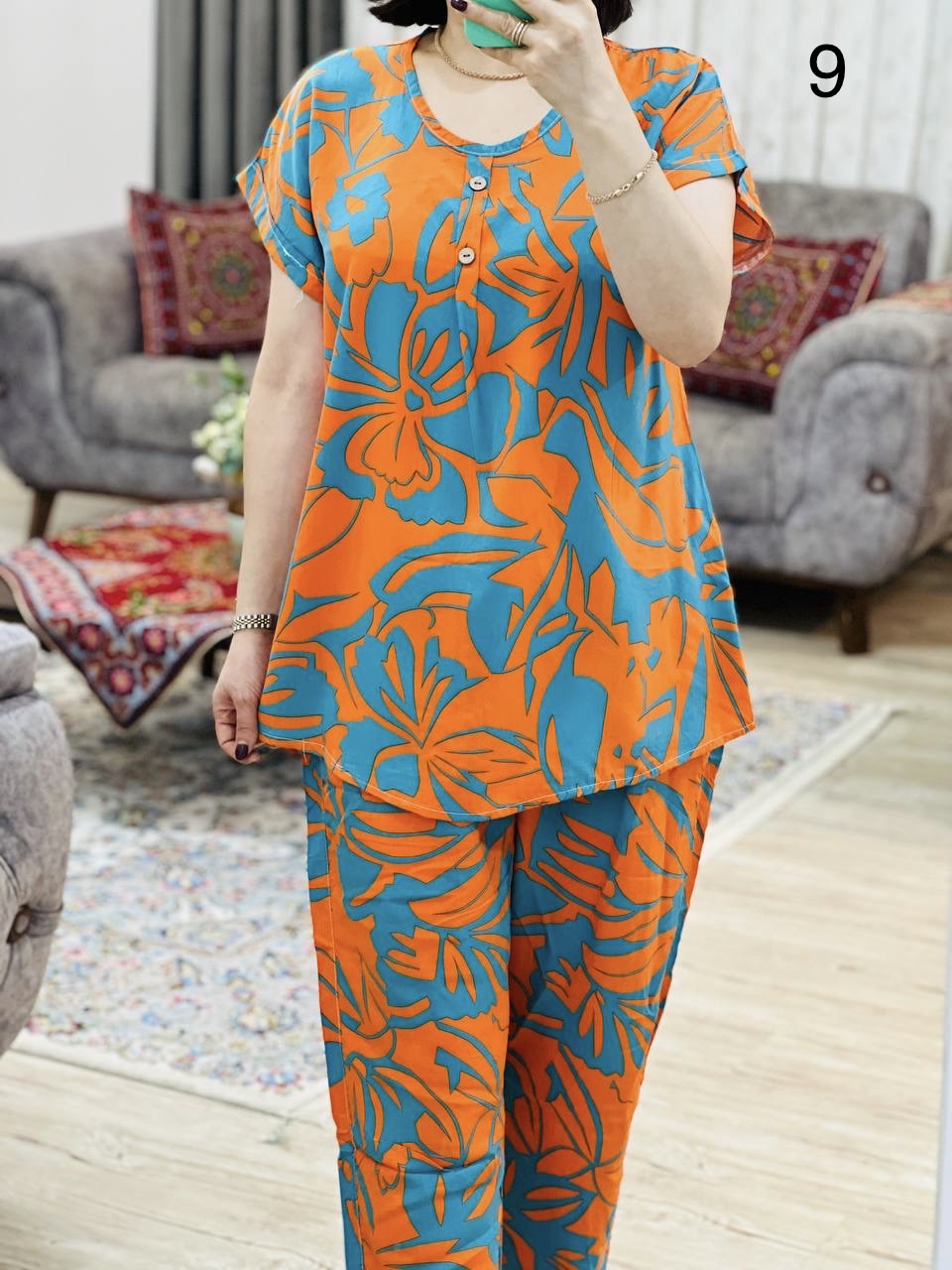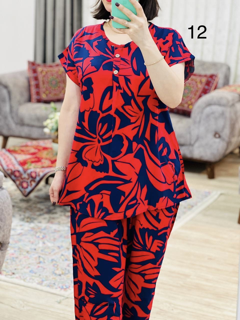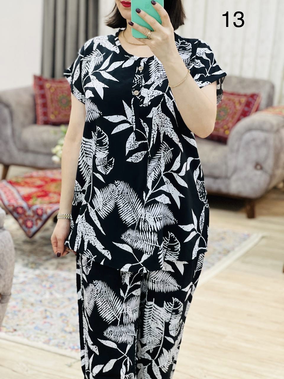 مناسب 38 تا 42 / دور سینه 108 / قد تیشرت 69 / قذ آستین از یقه 24 / دور باسن 116 / قد شلوار 98 / فاق 35 / دور ران 70