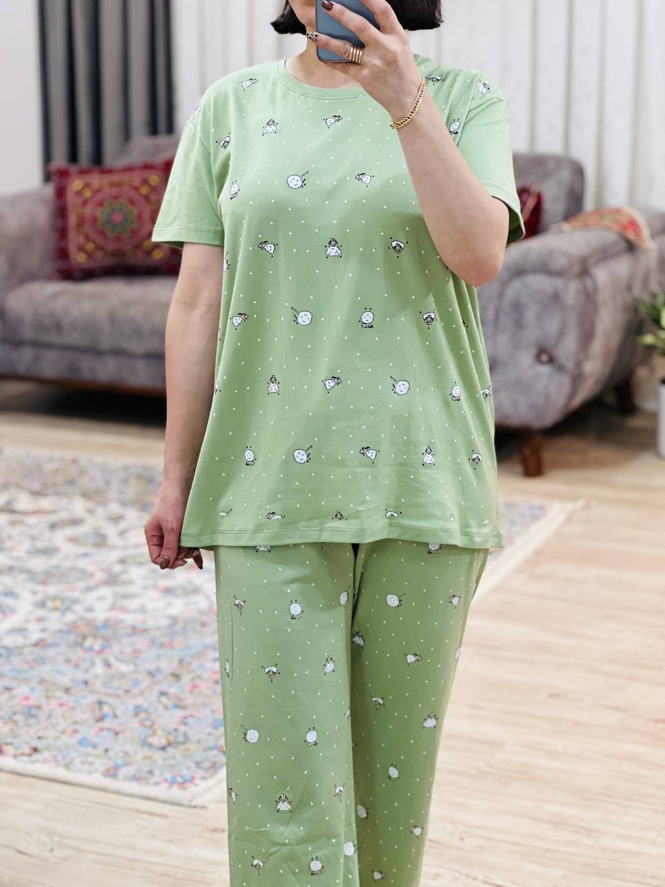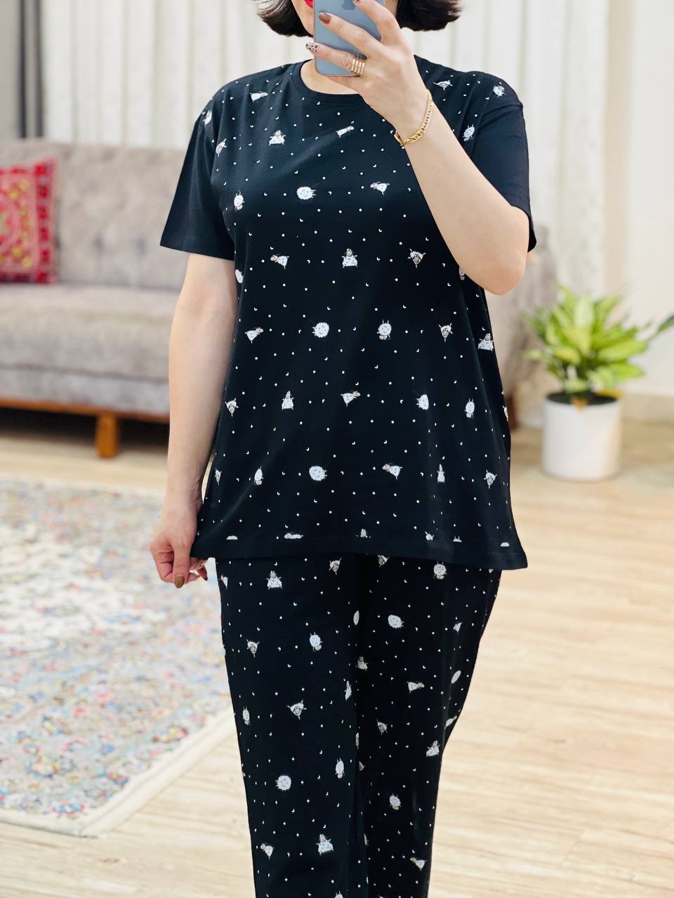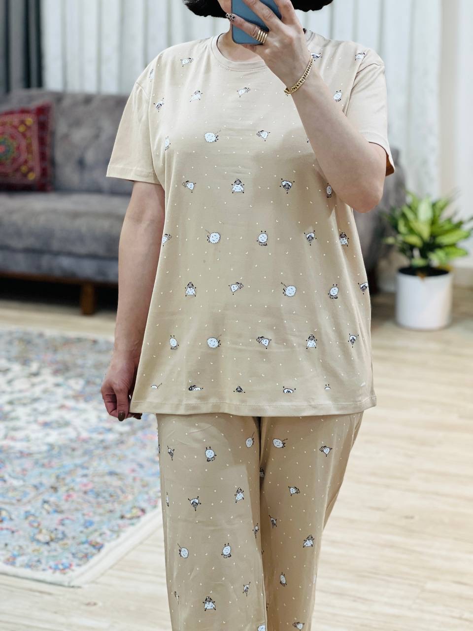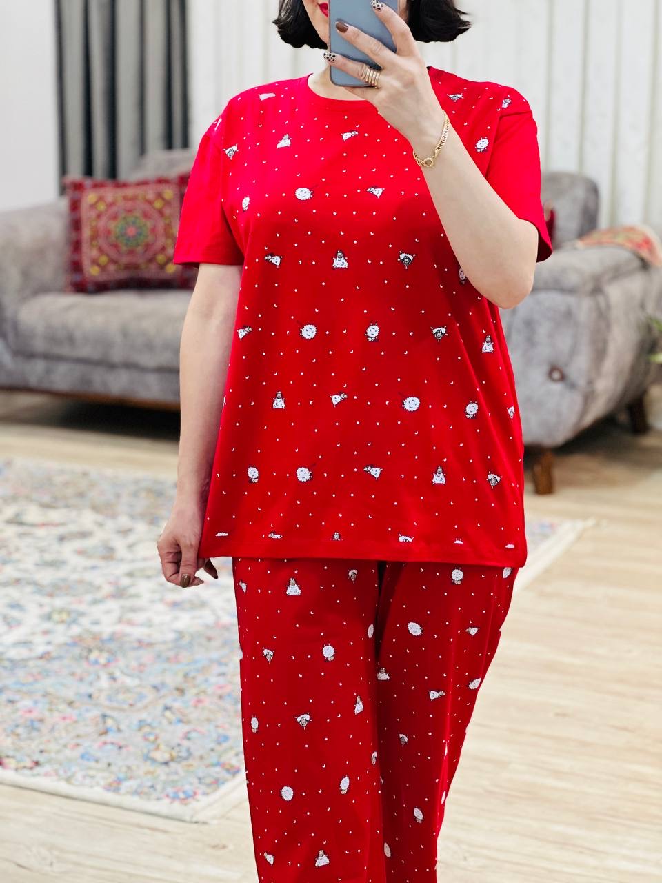 مناسب 38 تا 46 / دور سینه 112 / قد تیشرت 68 / قد آستین 17 /سرشانه 17 / قد شلوار 94 / فاق 31 / دور ران 64