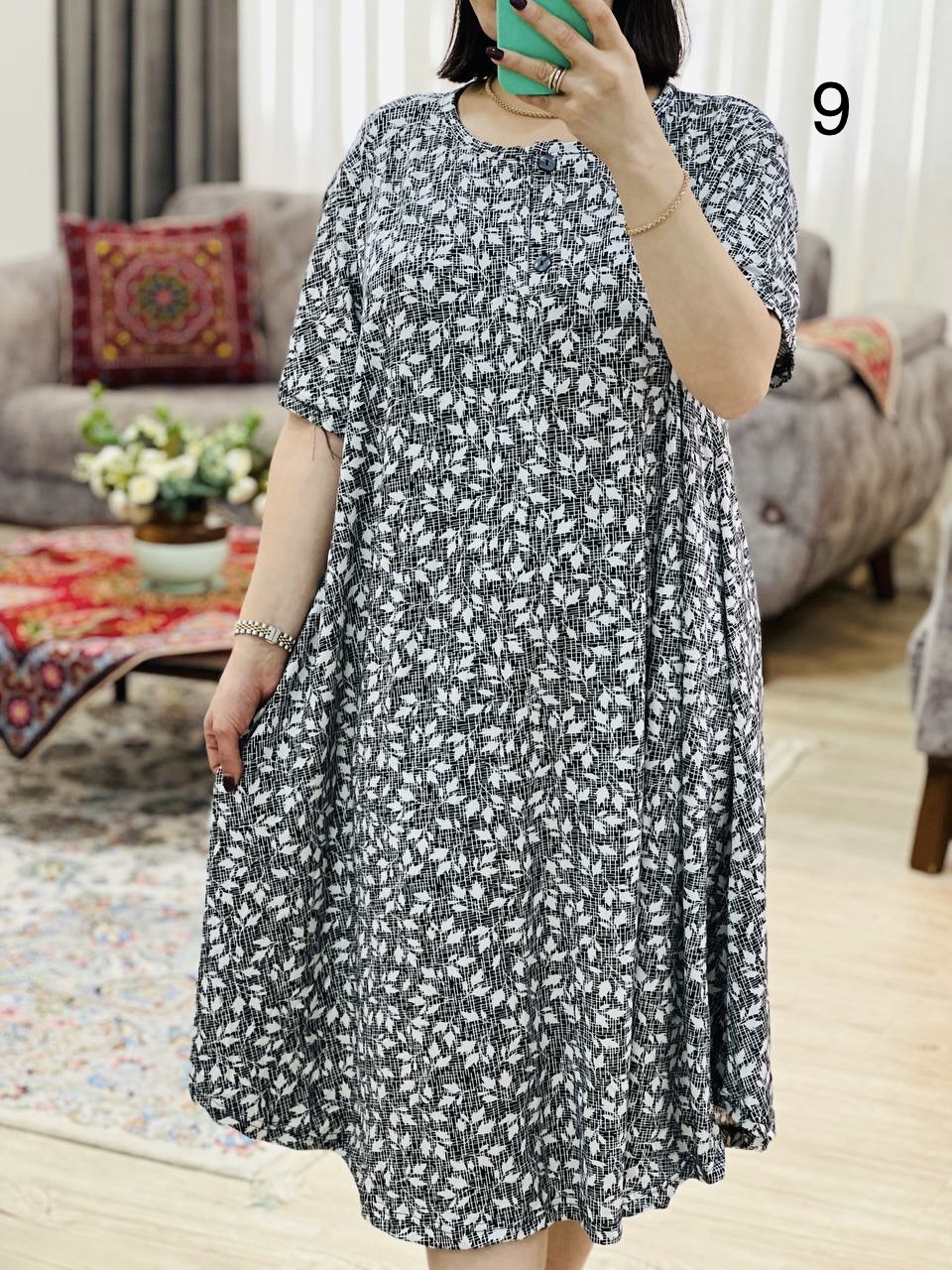 جنس پنبه ویسکوز / چاپ و رنگ ثابت / حدودا 20 سانت کشسانی دارد / جلو دکمه ها باز میشن / قواره ی هر تولیدی با تولیدی دیگر متفاوت میباشد لطفا حتما سانت در نظر بگیرید