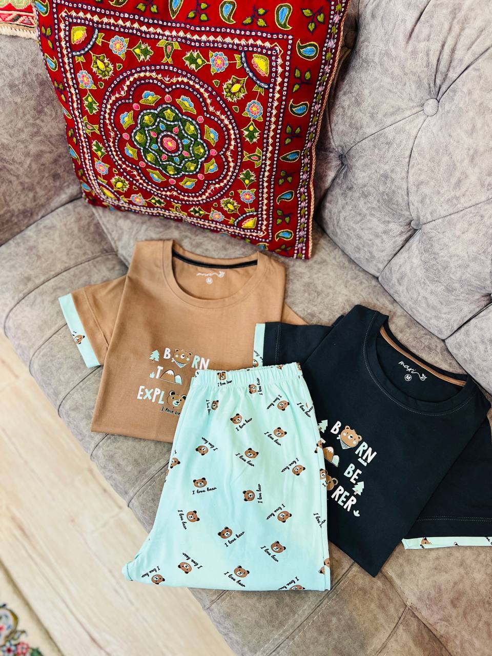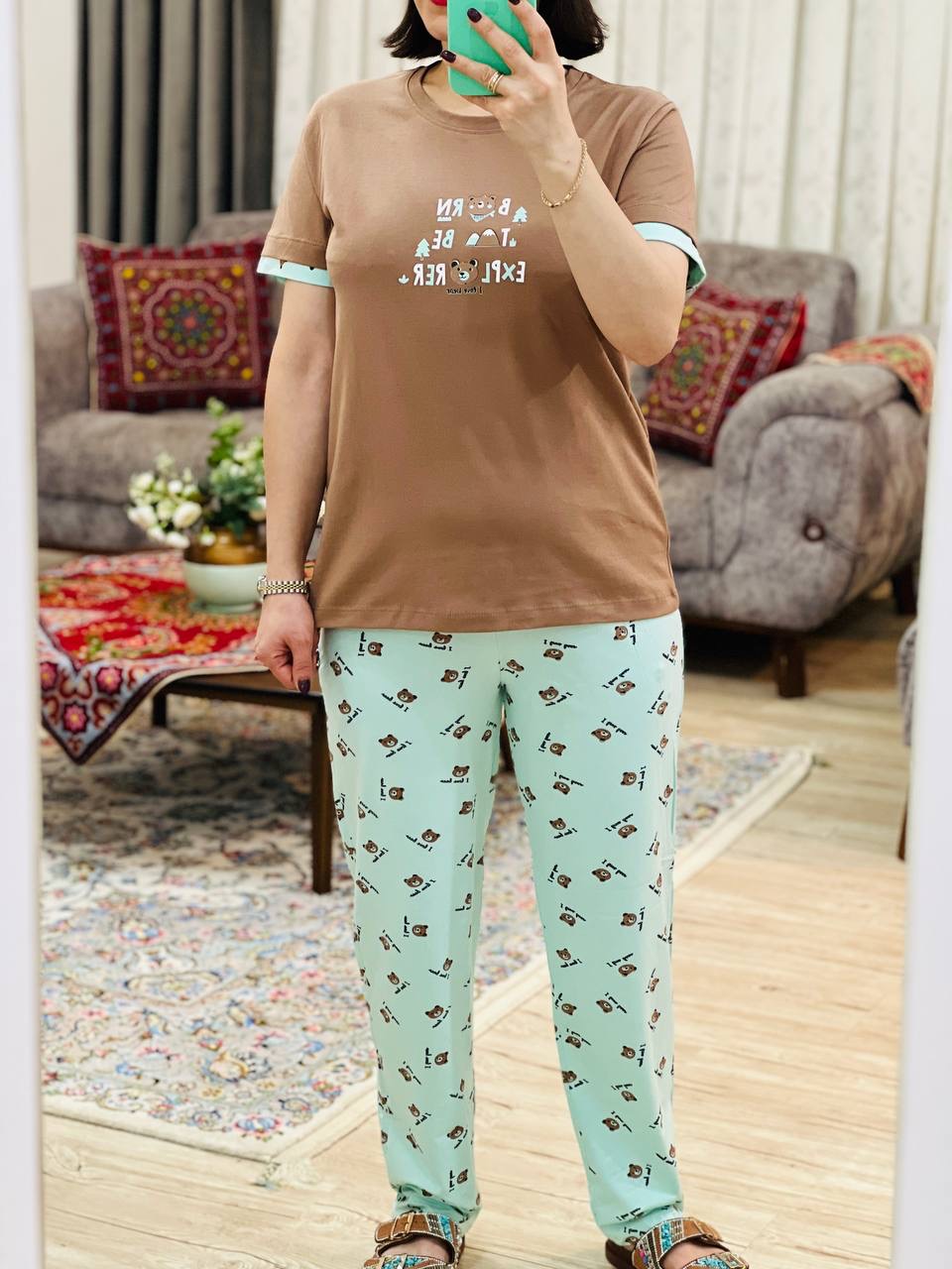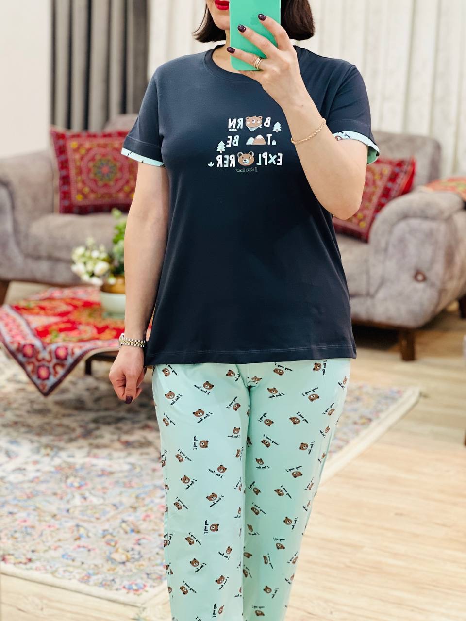 جنس تیشرت پنبه تک رو / جنس شلوار پنبه / چاپ و رنگ ثابت / حدودا 10 سانت کشسانی دارد / قواره ی هر تولیدی با تولیدی دیگر متفاوت است لطفا حتما سانت در نظر بگیرید