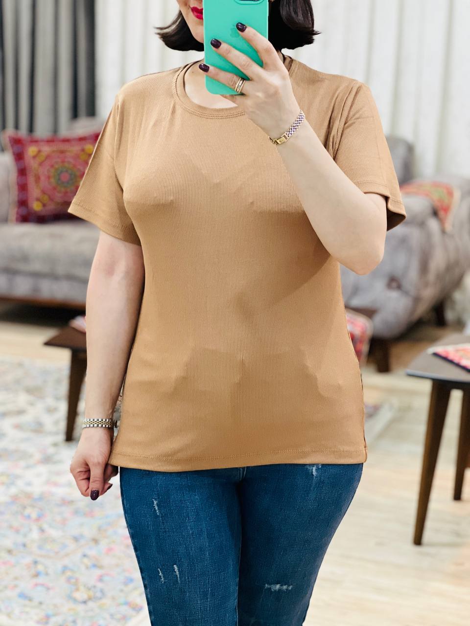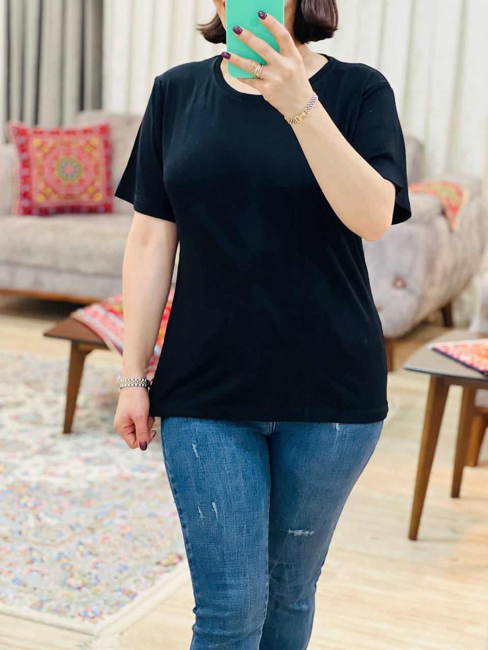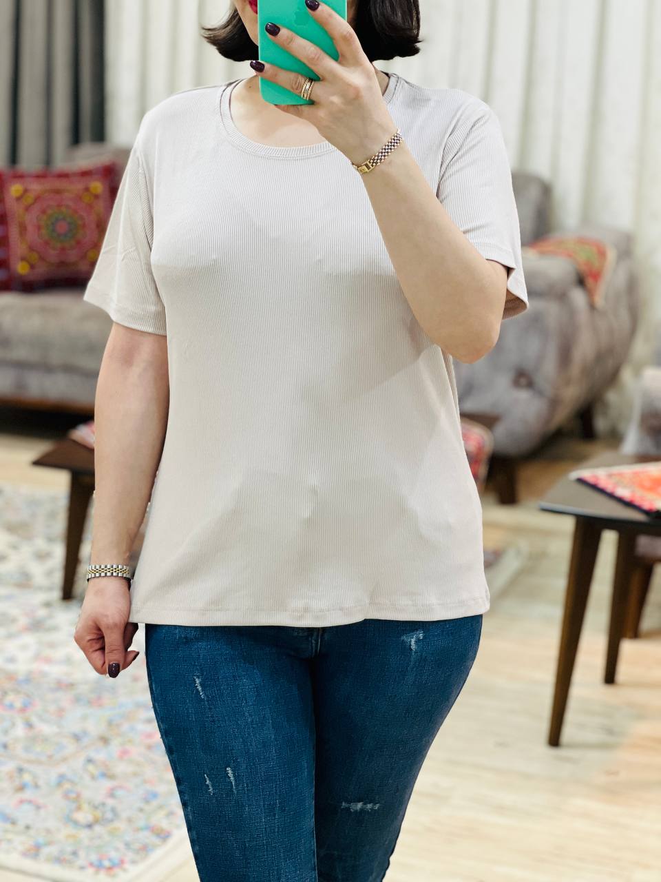 مناسب 38 تا 48 / دور سینه 106 / قد تیشرت 62 / قد آستین 19 / سرشانه 12