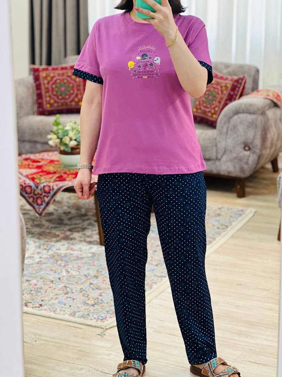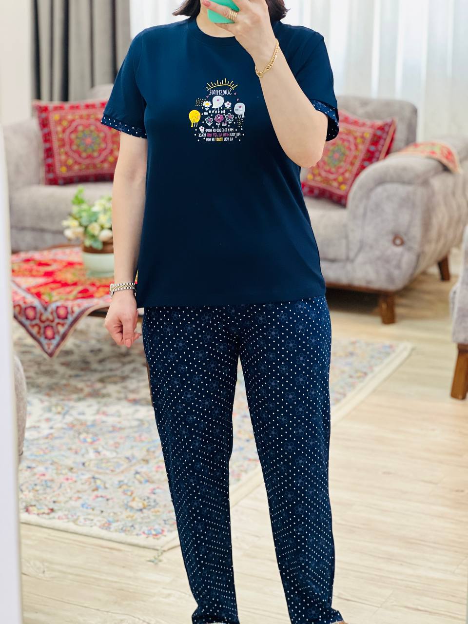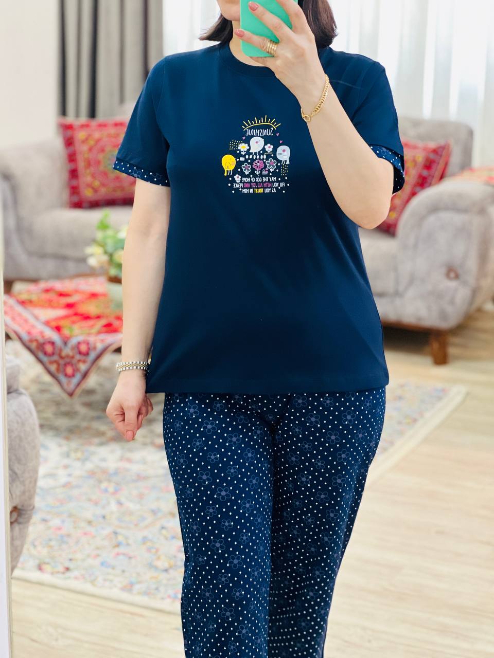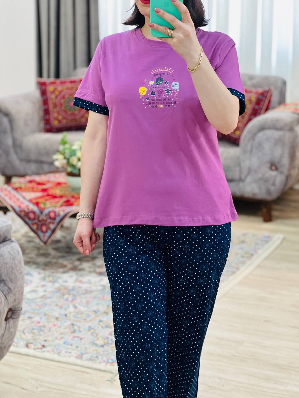 M مناسب 36 تا 38 / دور سینه 92 / قد تیشرت 64 / قد آستین 19 / قد شلوار 95 / فاق 30